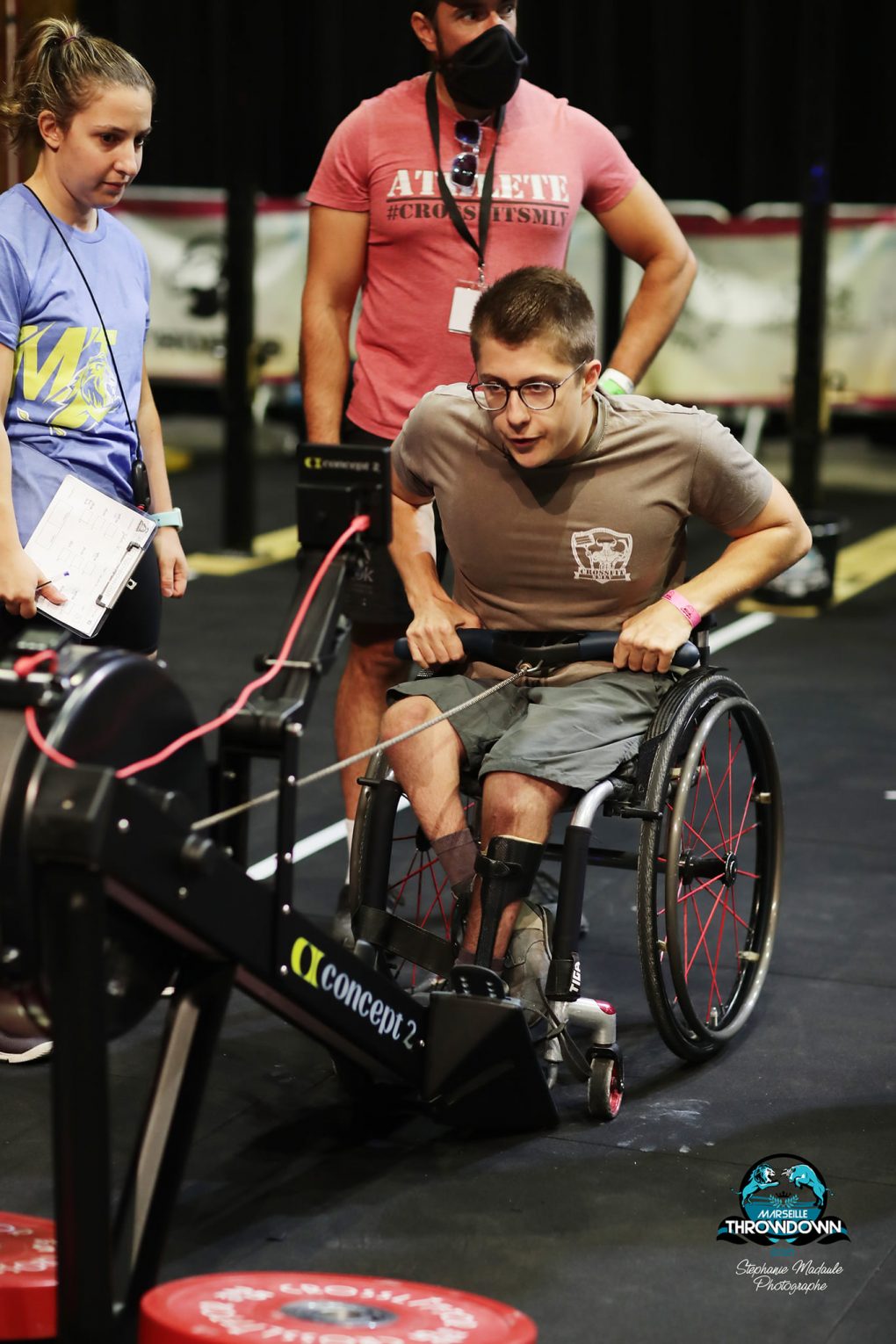 Adaptation pour Julien: rameur, burpees over the plate, deadlift aux dumbells. Les adaptations on était nombreuses sur cette épreuve ce qui nous a pas permis réellement de mesurer le niveau de fitness pour les départager. Mais nous retiendrons une ambiance entre les athlètes adaptives exceptionnelles et des performances incroyable.
